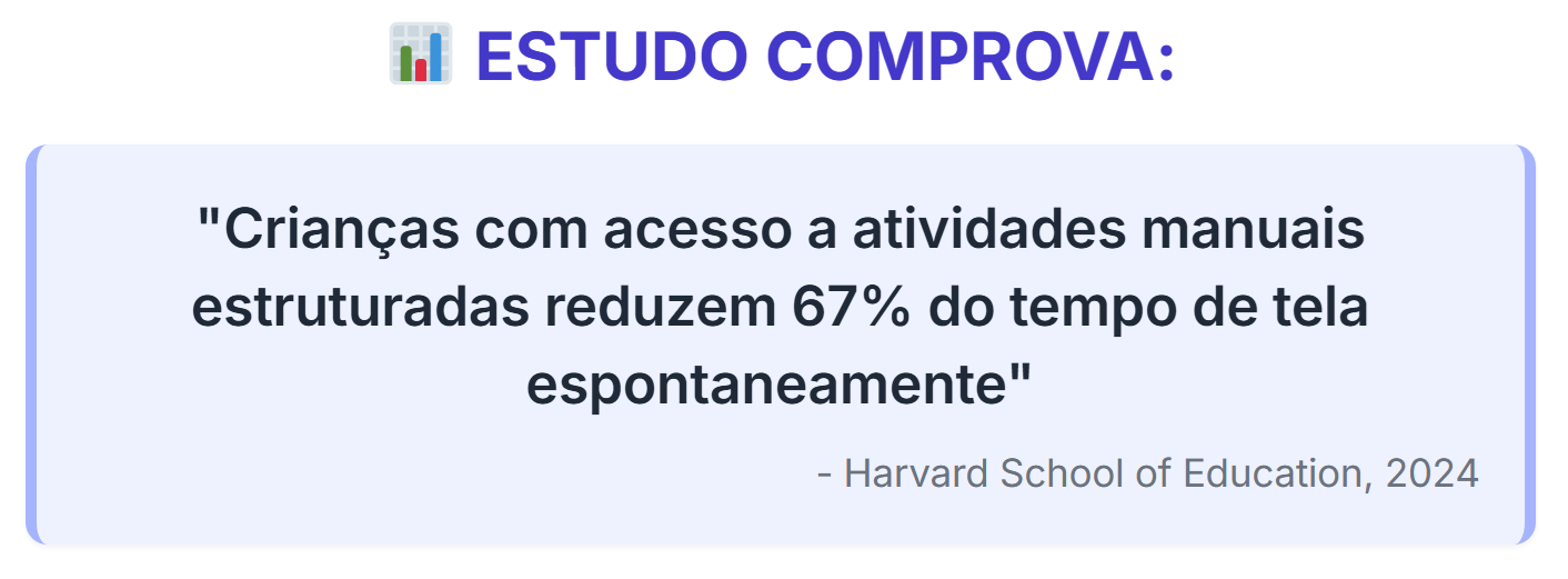 Um estudo recente da Harvard mostrou que quando as crianças têm opções interessantes e os pais têm ferramentas práticas, a redução das telas acontece naturalmente - sem conflitos, sem brigas.